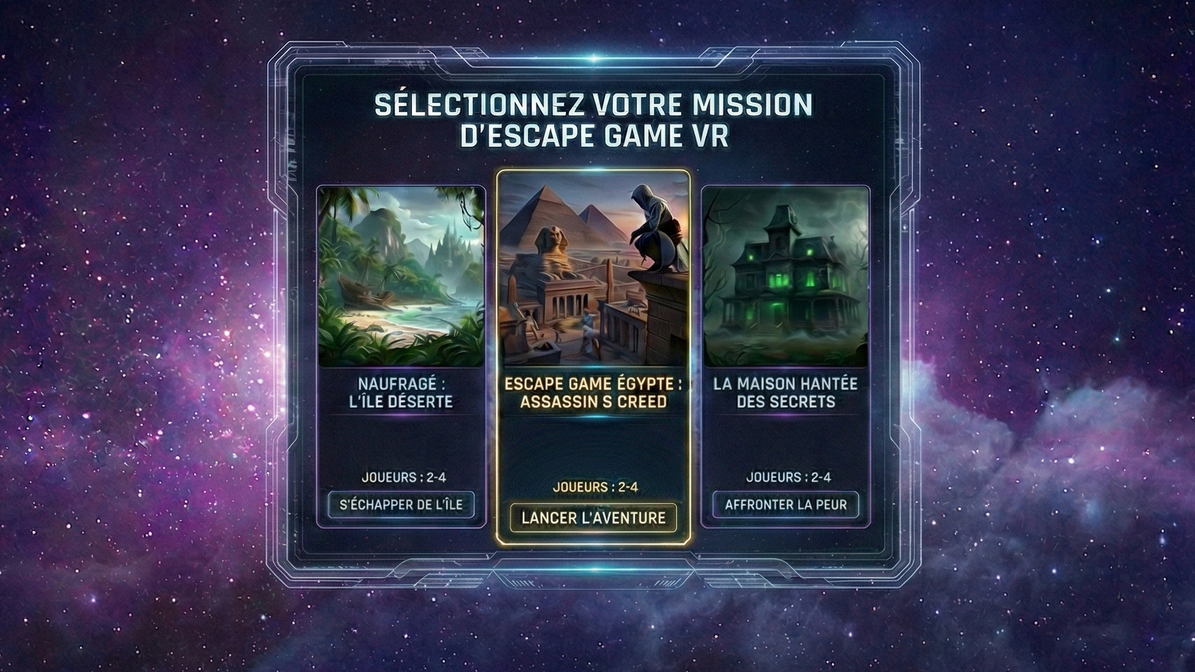 Découvrez notre vaste catalogue d’escape games en réalité virtuelle ! Si ces trois missions sont nos incontournables, notre ludothèque regorge de nombreux autres univers (science-fiction, enquêtes, action…) pour satisfaire toutes vos envies d’évasion.